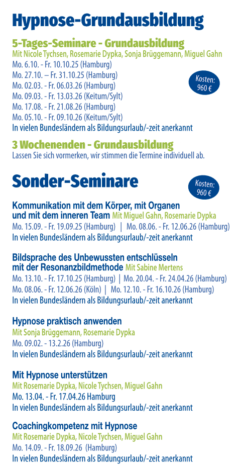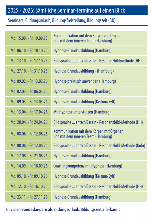 2025 - 2026: Hypnose-Seminare und Bildungsurlaub in Hamburg auf einen BlickHypnose Akademie Hamburg: Wir bieten laufend Seminare und Bildungsurlaub in Hamburg an.Hier sehen Sie die Termine auf einen Blick.